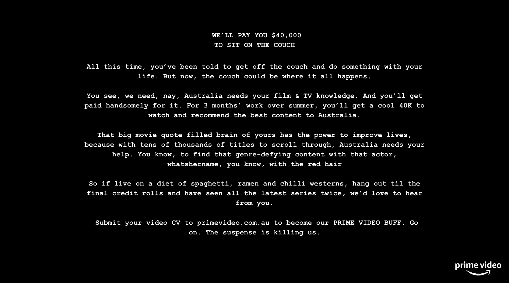 To inspire Aussies to choose Prime Video over little platforms like Netflix, we created a summer job. But no ordinary job. A job for the truly film and TV obsessed. Like a creature with a ring obsessed, nothing less.